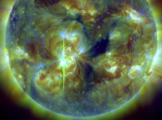 La gran mancha solar AR1890 crepita con las llamaradas fuertes. La última, alcanzó su punto máximo el 08 de noviembre a las 04:32 UT, X1 registrada en la escala de Richter de bengalas .El Observatorio de Dinámica Solar de la NASA registró un destello de radiación ultravioleta extrema desde el lugar de la explosión.